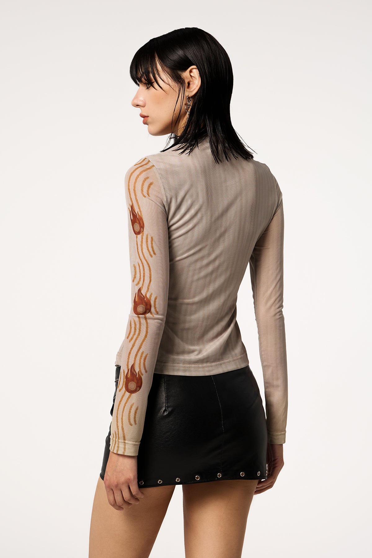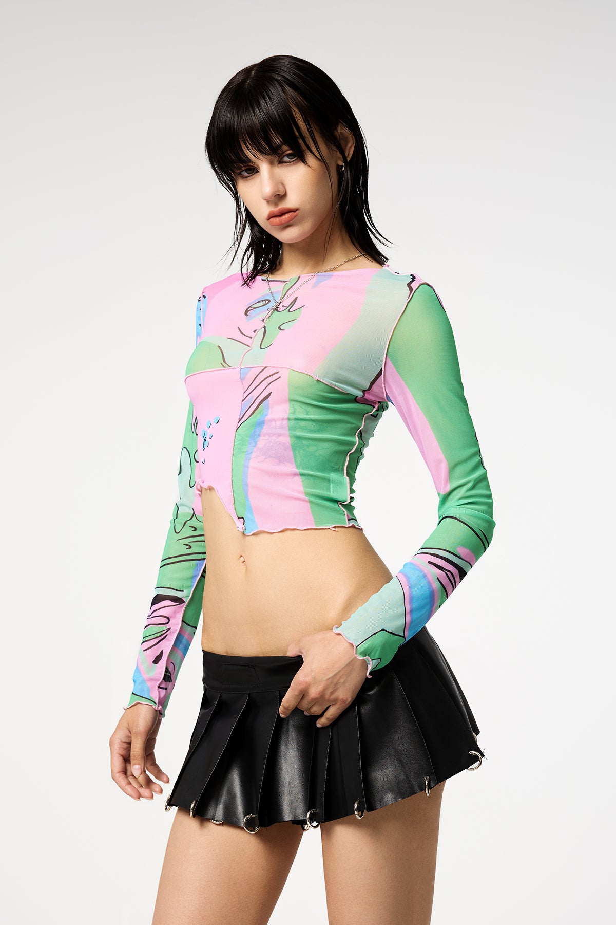 Glitter Pop Long Sleeve Y2K Printed Mesh Top
