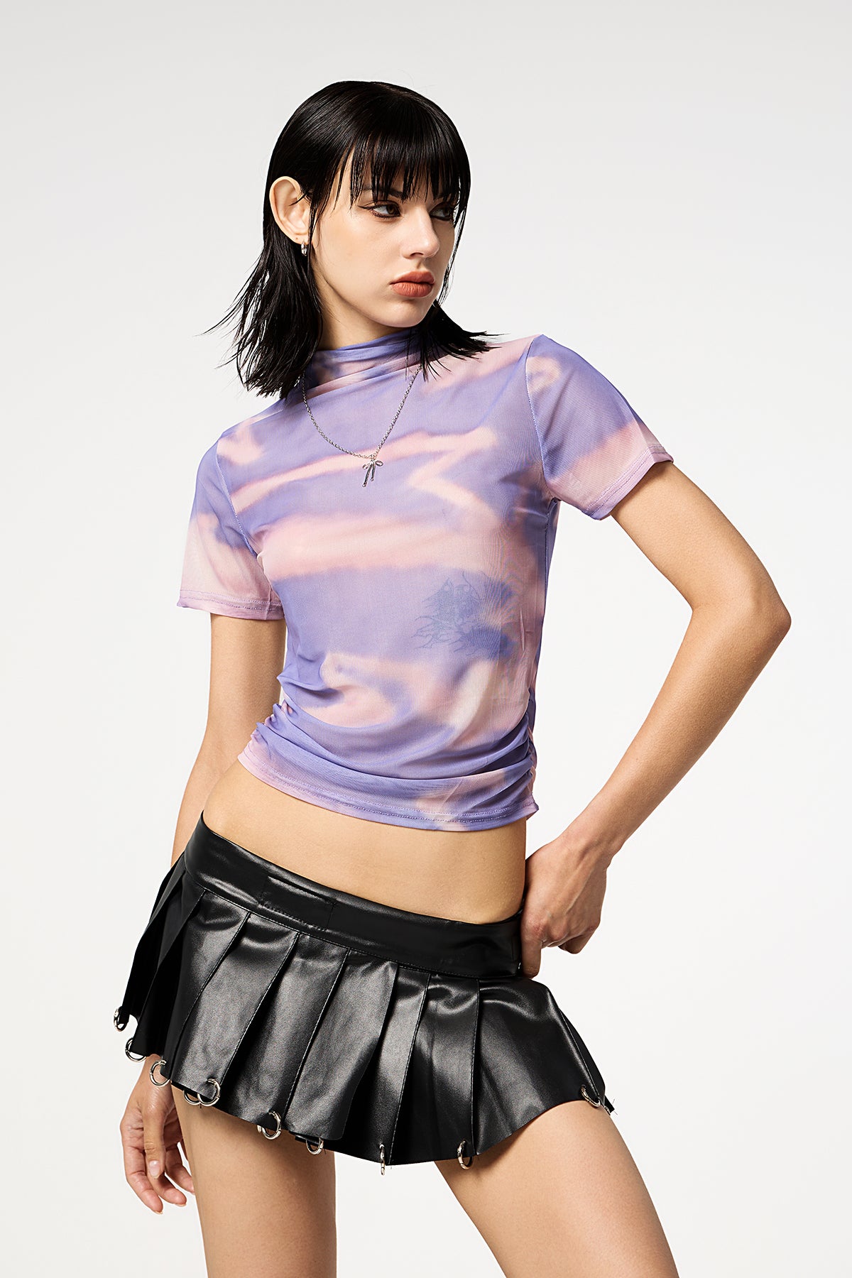 Simple Hue Mesh Y2K Printed Draped Crop Top