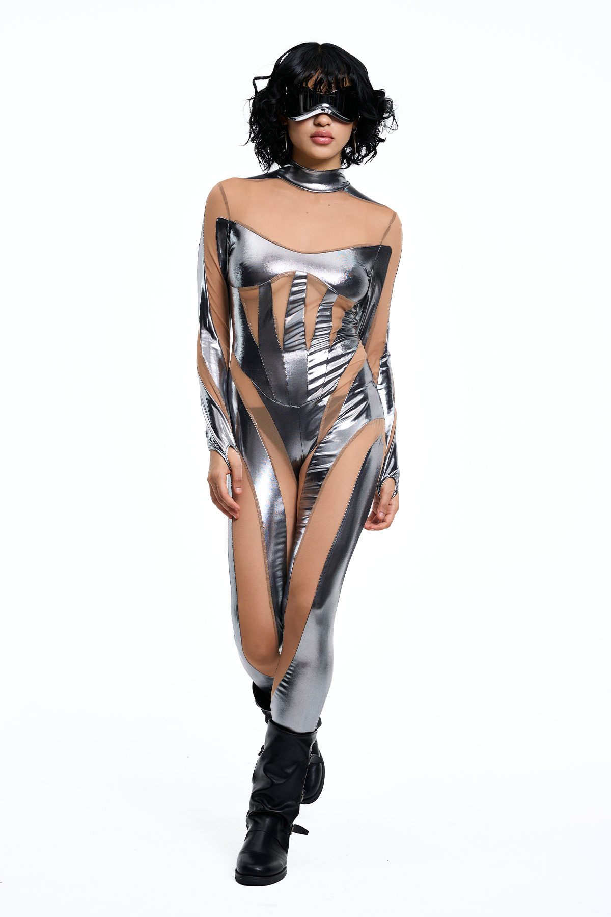 Grid Mood Mesh Long Sleeve Jumpsuit