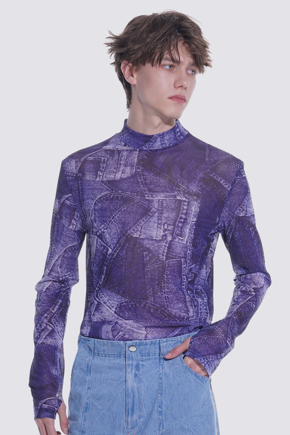 Shadow Layer Print Long Sleeve Mesh Top Blue