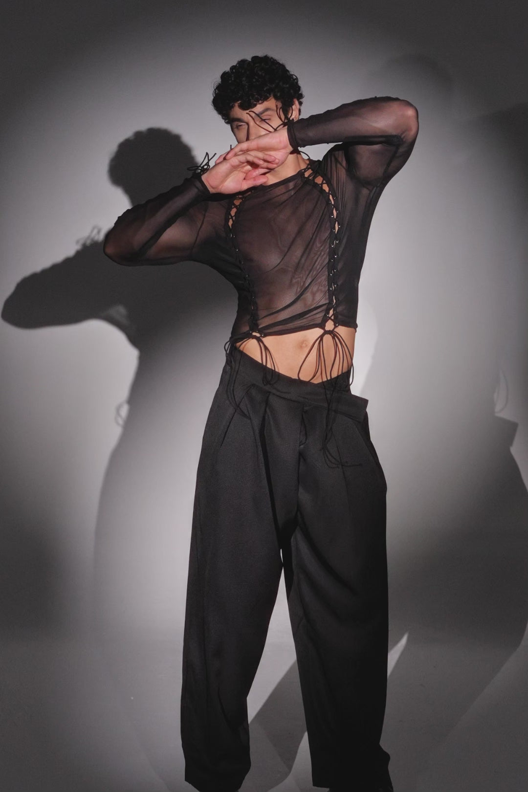 Dark Weave Mesh Long Sleeve Lace Up Top