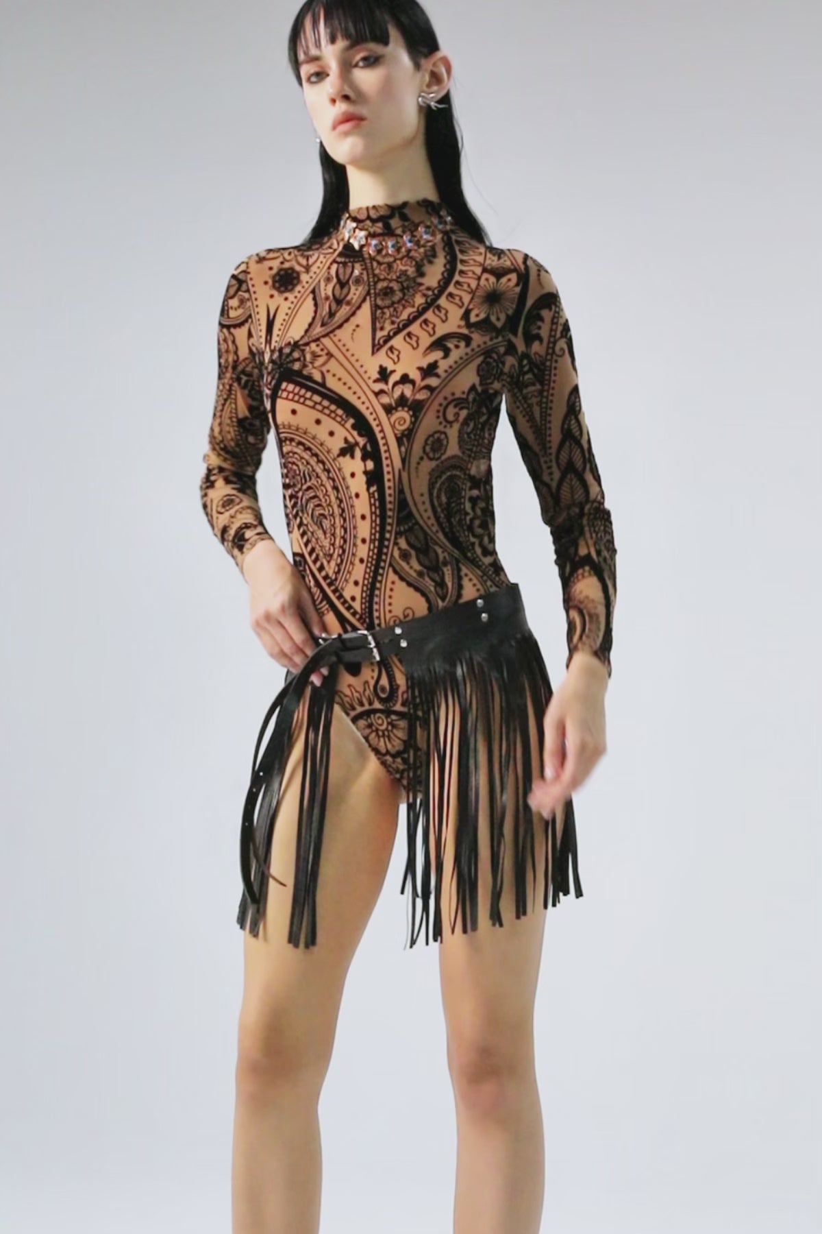 Elevate your style with the Ghost Wave Long Sleeve Print Mesh Bodysuit. Crafted from breathable mesh fabric, it offers a lightweight, comfortable fit that moves with you. The striking wave print adds a bold, modern edge, perfect for making a statement day or night. Its long sleeves provide coverage while maintaining a sleek silhouette, making it an ideal choice for layering or wearing solo. Embrace confidence and standout style with this versatile, fashion-forward bodysuit.