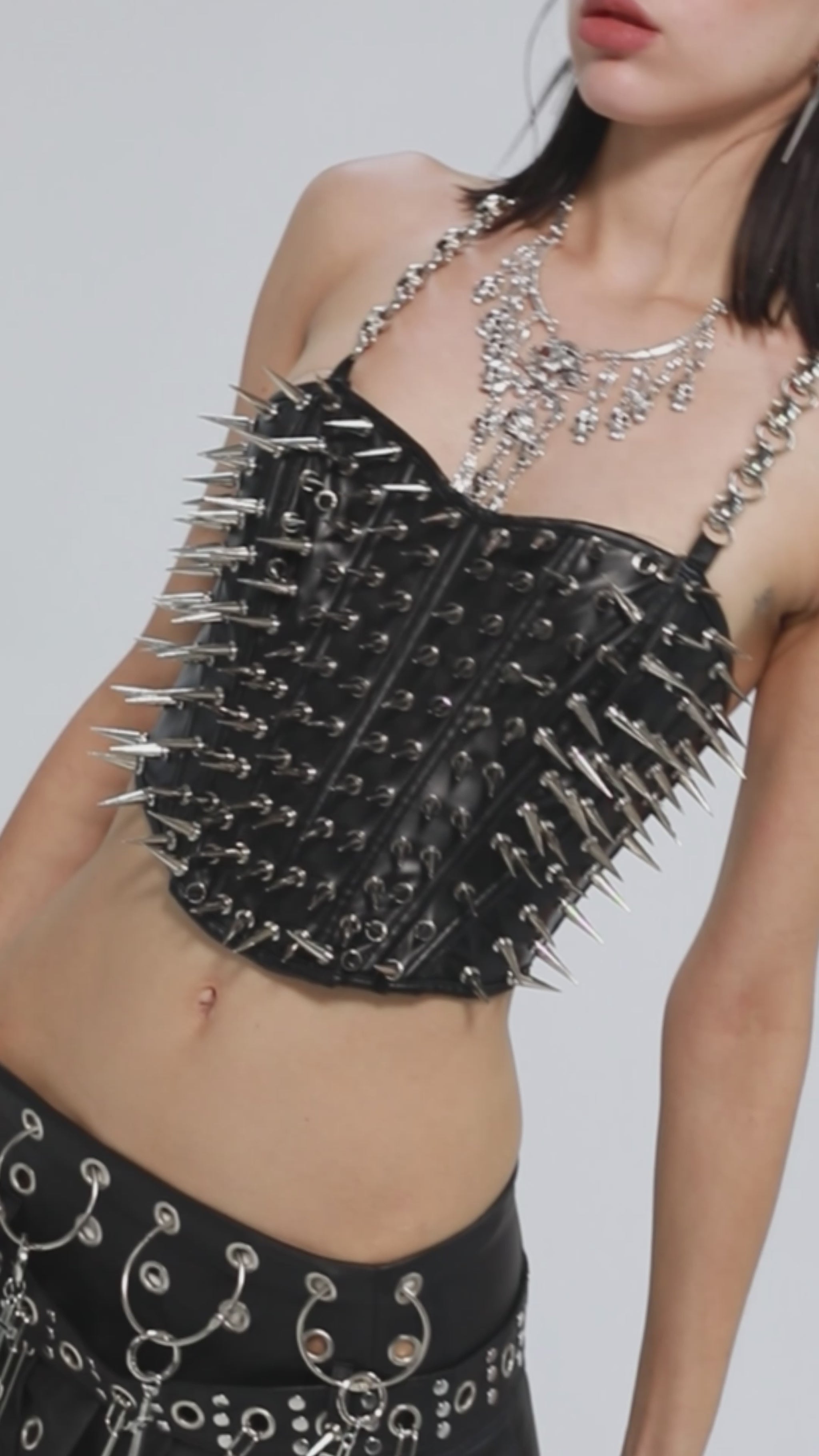 Vibe Slash Leather Rivet Embellished Y2K Skirt Set